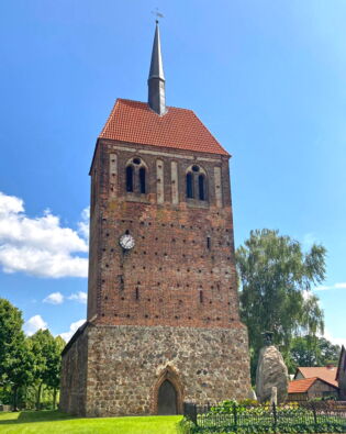 Feldsteinbau mit schiffsbreitem Westturm, Anfang 14. Jh. Vier bauzeitliche Portale, davon zwei zugesetzt, mit profilierten Gewänden aus Formziegeln. Die oberen Turmgeschosse in Backstein leicht zurückgesetzt. Das Glockengeschoss mit gekuppelten Schallöffnungen in spitzbogigen Blenden. Das Walmdach mit Dachreiter Ende 15. Jh. Instandsetzung des Dachwerks 1997.