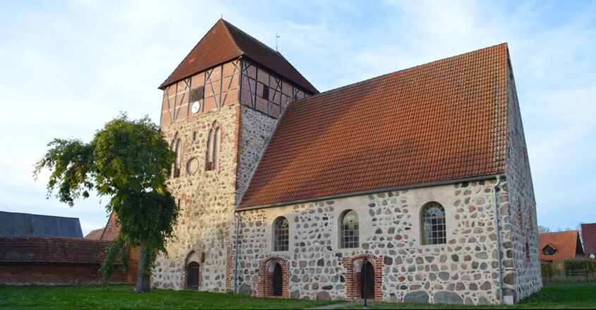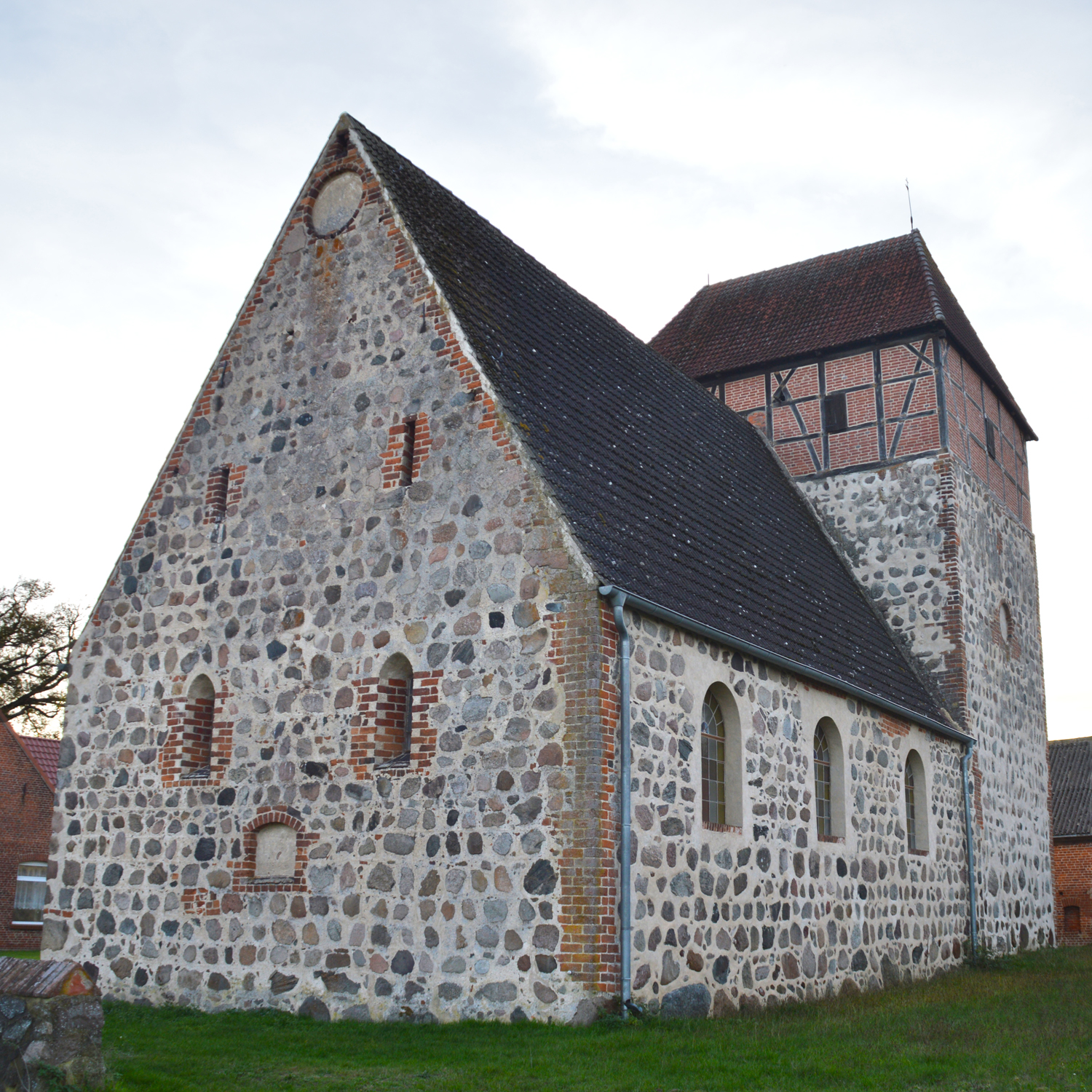 Feldsteinbau mit spätgotischem Kreuzstreben-Dachwerk von 1449 (d) und kurz darauf angebautem Westquerturm. Der spätere Fachwerkaufsatz mit Zeltdach barock Ende 17. Jh. In der Südwand zwei spitzbogige Backsteinportale mit Spitzbogenblenden. Stichbogiges Turmportal mit hoher Spitzbogenblende, darüber dreiteilige und kreisförmige Blenden. Die Ostwand im ursprünglichen Zustand mit zwei kleinen Lanzettfenstern und Stichbogenblende, die übrigen Fenster vergrößert. Instandsetzungen von Dachwerk und Holzbalkendecke 1991/92, der Fassade des Kirchenschiffes 2012.