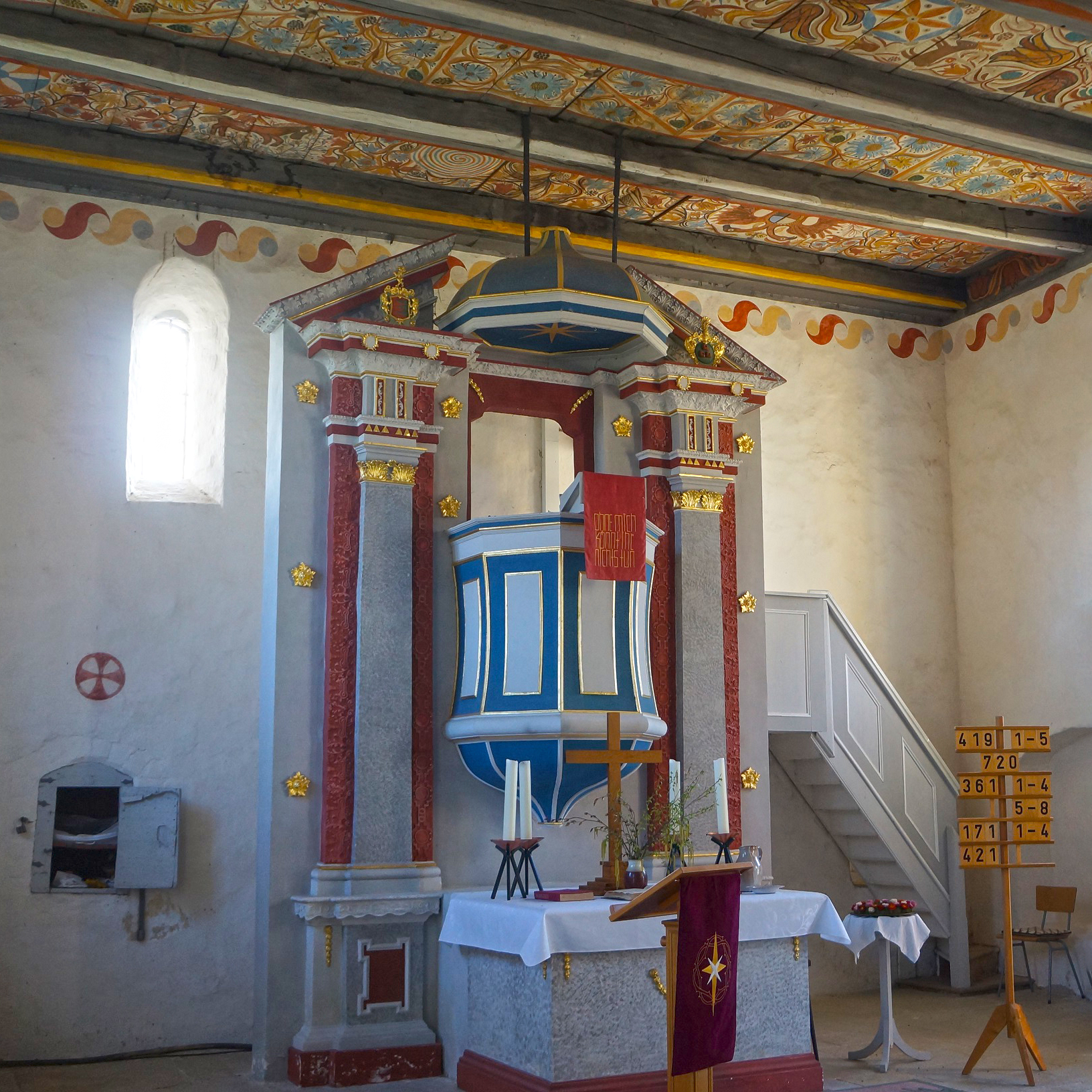 Innen Holzbalkendecke von 1670/75 (d) mit farbenfroher Bemalung, 1992 restauriert und ergänzt. Emporen von 1737. Kanzelaltar 1. Hälfte 18. Jh., mit hölzernem Korb und flankierenden Pilastern aus verputztem Backstein. Der Beichtstuhl von 1691.