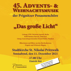 Die Advents- und Weihnachtsmusik findet jedes Jahr in einer anderen Prignitzer Stadt, einschließlich Neuruppin, Kyritz und Wittstock, statt. In diesem Jahr ist die Kirchengemeinde Pritzwalk Gastgeber. Für die Bläser und Bläserinnen gilt die 2Gplus-Regel, für die Besucher die 2G-Regel.