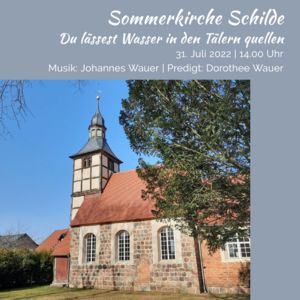 Am 31. Juli um 14:00 Uhr steht die Sommerkirche unter dem Thema „Du lässest Wasser in den Tälern quellen“ - die Liturgie/Predigt hält Dorothee Wauer, die Musik gestaltet Johannes Wauer.