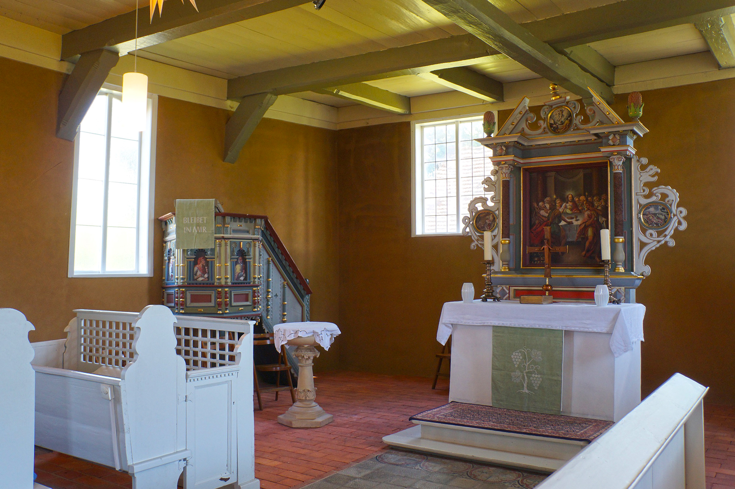 Der Altar (von 1682) und die Kanzel sind aus der Zeit der Spätrenaissance. Das Altargemälde zeigt eine Abendmahlsdarstellung. Die Kirchenbänke von 1664 haben eindrucksvolle Bankwangen, deren schlichte Schönheit nach der Aufarbeitung der Bänke wieder richtig zum Tragen kommt.