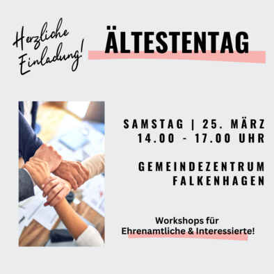 Herzliche Einladung zum Ältestentag in Falkenhagen am 25. März! Spannende Workshops werden angeboten.